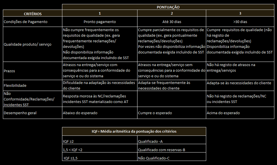 A procura constantemente melhorar a qualidade do seu serviço sendo o contributo e desempenho das partes interessadas fundamental para que a melhoria contínua seja alcançada. Assim, no âmbito nosso Sistema de Gestão da Qualidade, de acordo com a norma ISO9001, informamos que avaliamos o desempenho nossos fornecedores com base nos seguintes critérios: